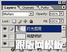 14.这时候图层面板如图15,在图层面板上合并碗壁钢纹图层和碗口钢纹图层,把做好的打光图层拖到最上层,点选图层模式的小三角钮,在下拉菜单中选择Mutiply(正片叠底)模式。这样就可看到如图15碗上具立体感的钢纹了。