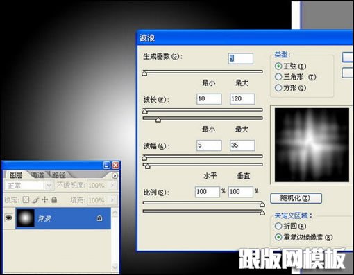 2、设置前景色为白色,在工具箱中选择“线性渐变工具”,设置渐变类行为前景色到透明,并使用径向渐变填充背景图层。执行“滤镜”→“扭曲”→“波浪”命令,设置弹出对话框如图中所示效果: