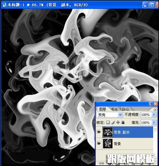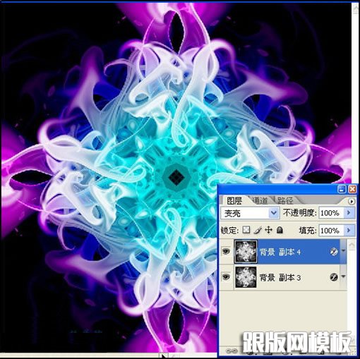 3、按“Ctrl+Alt+T”键调出自由变换并复制控制框,然后在控制框中单击鼠标右键,在弹出菜单中选择“旋转90度(顺时针)”命令,按“回车”键确认操作。得到背景副本图层,并将该图层混合模式设为“变亮”: