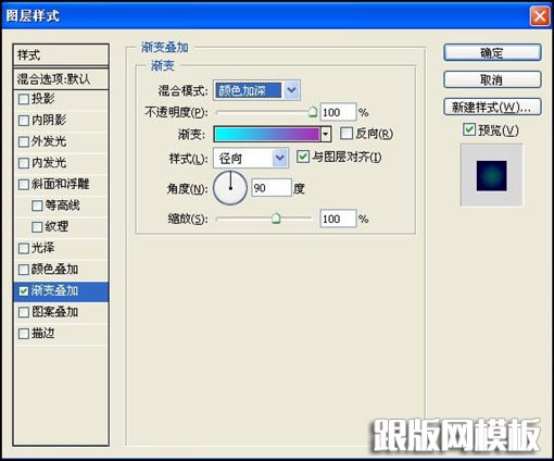 5、按“Ctrl+Shift+E”键拼合可见图层,在图层面板中单击“添加图层样式”,在弹出菜单中选择“渐变叠加”命令。如图设置弹出对话框: