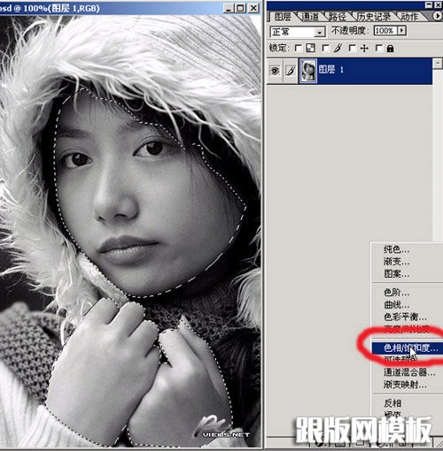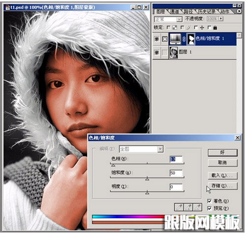 1.用钢笔工具勾出脸部、手部轮廓,变为选区,按Ctrl + Alt + D 羽化一个象素,建立调整图层:色相/饱和度,如图1,参数设置如图2