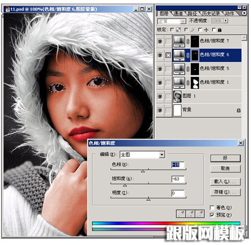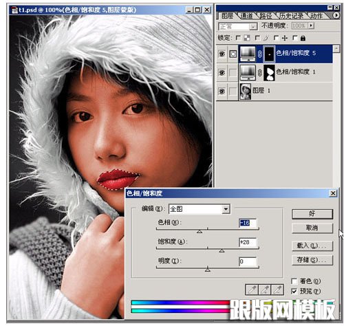 2.用钢笔工具勾出唇部,变为选区,按Ctrl + Alt + D 羽化一个象素,建立调整图层:色相/饱和度,参数设置如图3,同样的方法处理眼睛,眉毛效果如图4