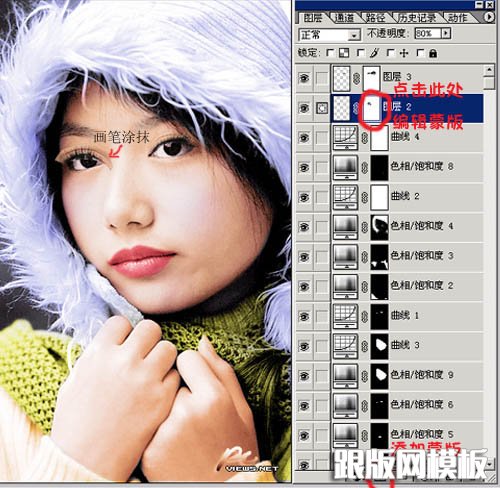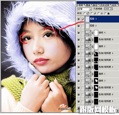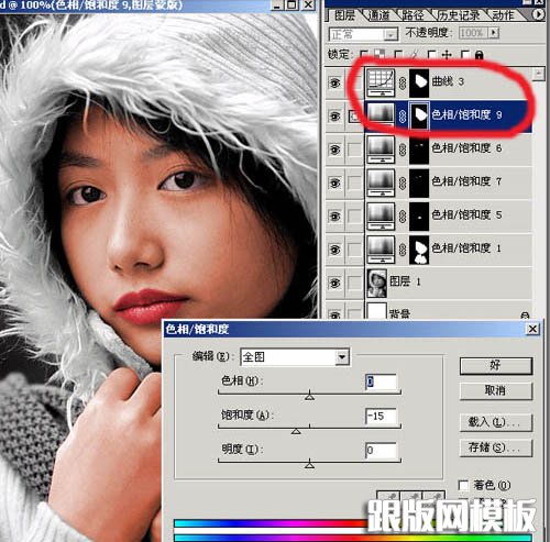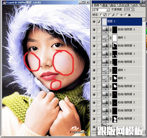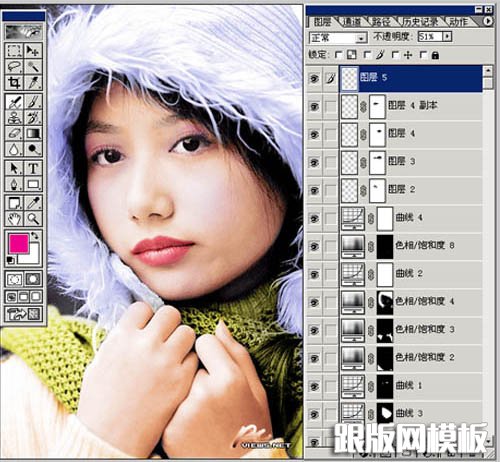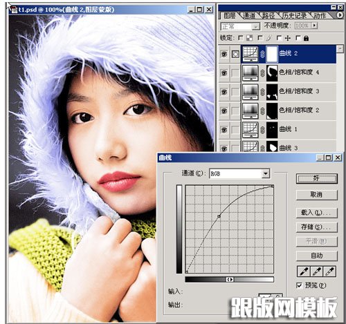3.现在来单独调整脸部的颜色。降低一点脸部的饱和度,用曲线来增加亮度