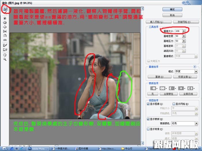 1、首先复制图层,然后滤镜——液化,观察人物觉得手臂,肩和脸看起来使MM丰满的地方,用“褶皱工具”调整适当画笔大小,这里慢慢推的。