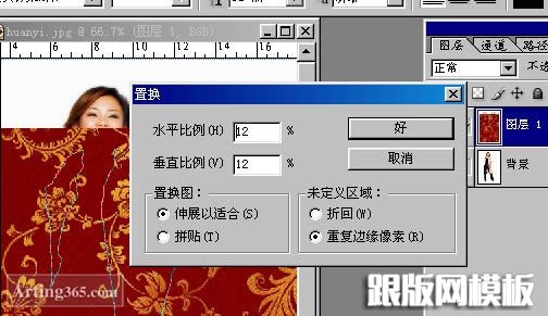 5、好了,回到图案图层开始用到置换命令(滤镜-扭曲-置换)回到图案图层,使用置换命令,如图。