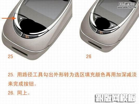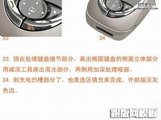 33、现在处理键盘细节部分,画出椭圆键盘的侧面立体部分,用减淡工具画出高光部分,两侧用加深工具处理暗部。