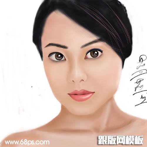 3、接下来就比较费功夫了,如何让面部明暗度很好的过渡,可以取不同相近色,降你喷笔的透明度,或者,选高样色,选画笔的,颜色加深,或柔光,都有不用过度效果。这个也要多练。
