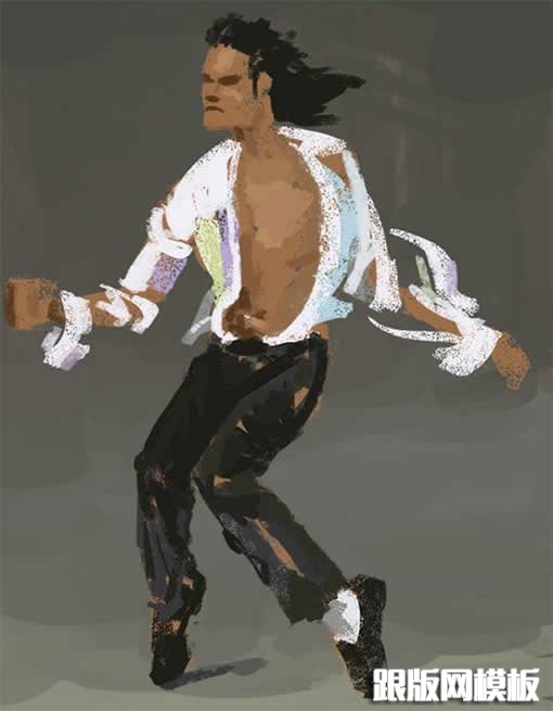 2、于整体人物动作动势比较大,带动衣物也有一定的动势和韵律。同样比较概况的开始描绘衣物。在开始阶段可以放开色彩,多铺一些环境色。