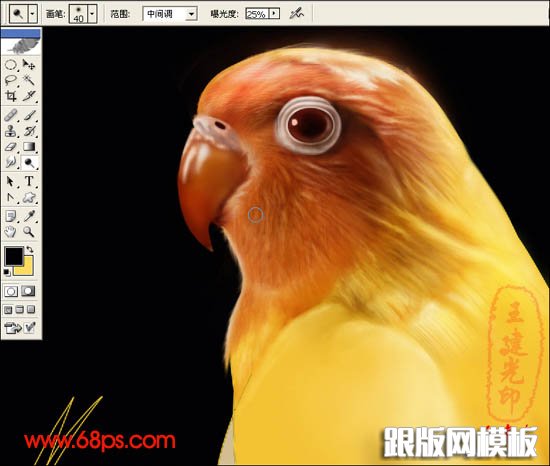 把前景色调为#F16531,用画笔工具在头部涂上淡红色,然后,用加深/减淡工具把明暗关系处理好,再用涂抹工具将头上的绒毛表现出来,也可结合使用钢笔工具进行绘制。在绘制的时候要注意明暗之间的变化,如图3。