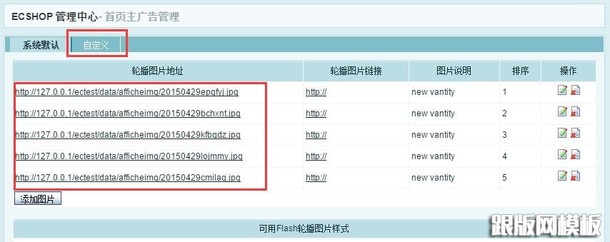 许多效果都可以采用SuperSlide进行整合,这里就不提供下载链接,直接搜就是了。笔者选择这个插件基本可以搞定现有的JS效果,引用也简单。ECSHOP轮播图默认的是flash,搜索引擎不抓取。有自定义播放器,这两者只可以选择其中一个。先把轮播图填写完之后,按下图切换至自定义。
