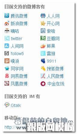(除了图中成功绑定的账号外,跟版模板网还试着绑定腾讯微博和搜狐微博,发现无法成功绑定,也许是我忘了账号和密码了;其他的微博和SNS跟版模板网没有测试过)