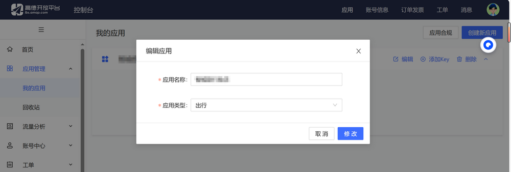 1、登录后进入"控制台",点击"应用管理" → "我的应用"