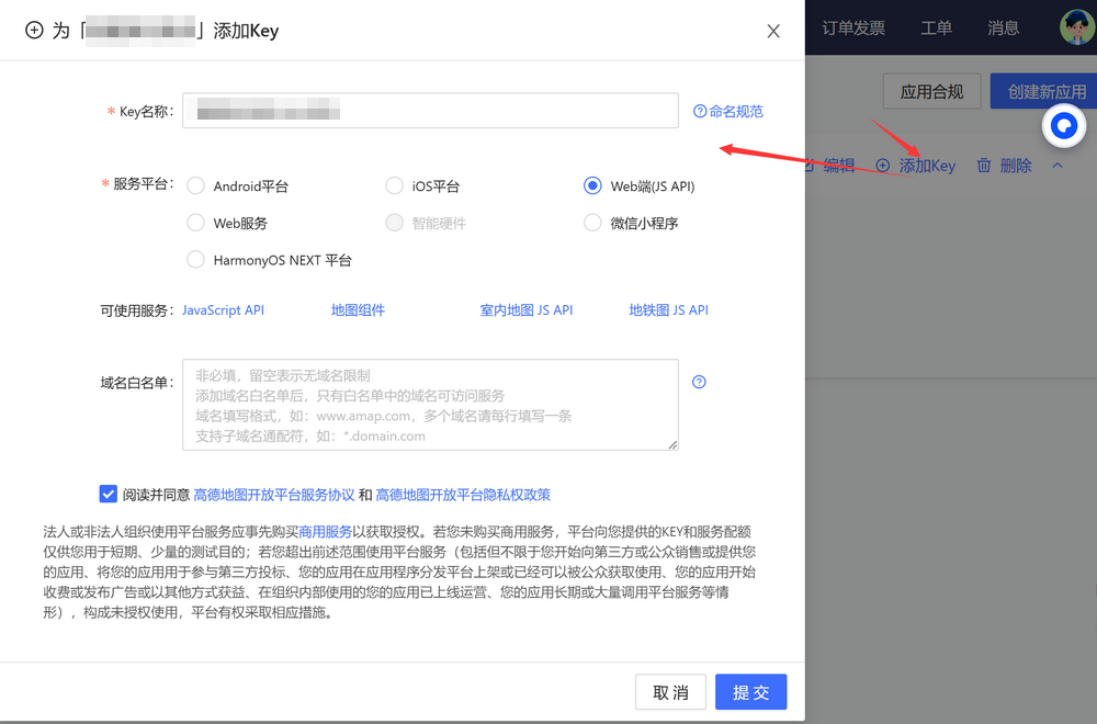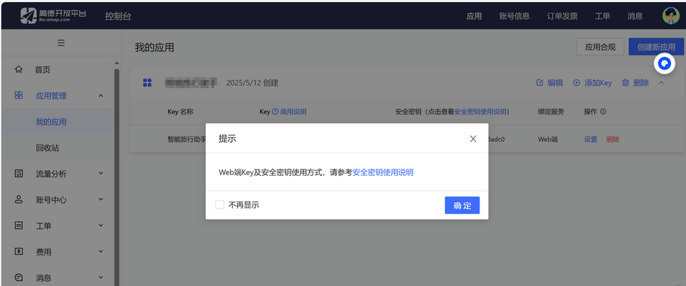 3、在应用列表中找到刚创建的应用,点击"添加Key",填写Key信息: