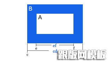 如上图所示, 对象A(白色矩形)周围有蓝色边框B, 可以看出A的实际宽度为ef, 而IE5不这么认为, 它把cd的长度定义为对象A的宽度, 这个bug在边框的宽度小时几乎察觉不到, 但在边框与对象宽度相差不大时显得尤为明显.