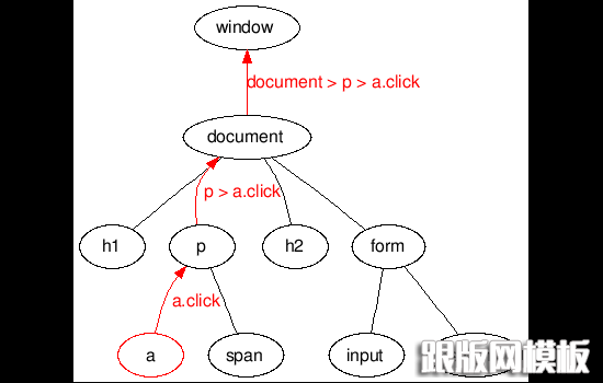 click事件接着会向树的根方向传播,广播到父元素,然后接着是每个祖先元素,只要是它的某个后代元素上的单击事件被触发,事件就会传给它。