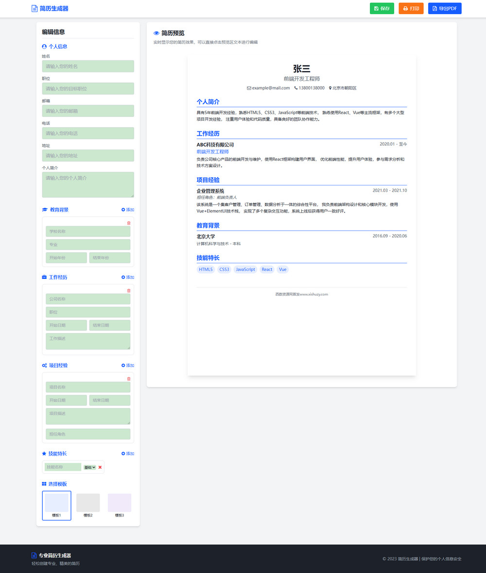 导出功能:支持打印和导出 PDF 格式,方便用户投递简历。
