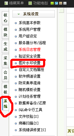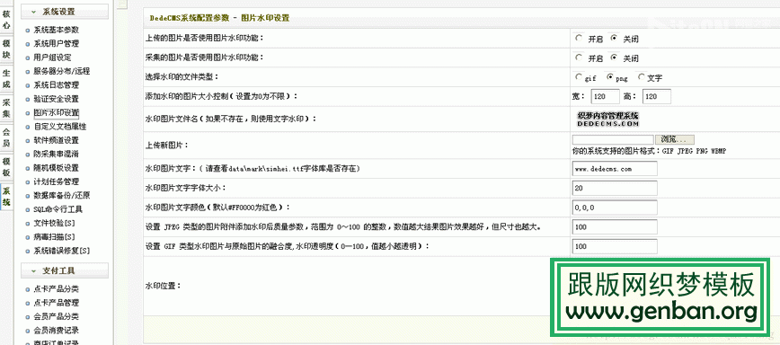 织梦怎么去掉上传图片的水印改为自己设计的水印 2015-05-10dedecms教程 126 在用织梦建站或仿站中,都会遇到上传图片这个功能,但是这图片上传是有水印,所以我们要把水印去掉或者改为自己设计的水印。 一共有几个步骤: 1、登录织梦后台 2、点击系统设置,在点击系统设置里面的图片水印设置 ,,如图 在这里就可以选择是否关闭上传图片加水印的功能,也可以替换自己的水印 The End