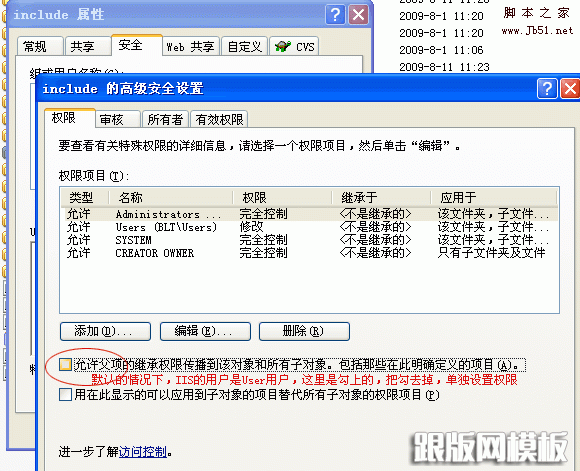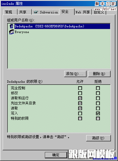 1.4.赋予apache安装目录(比如:D:/apache2.2)以及web目录(比 如D:/wwwroot)DedeApache帐号的可读写权限,去除 各磁盘根目录除administror与system以外的所有权限,赋予DedeApache安装 目录所在的磁盘根目录apache帐户的可读取列目录权限