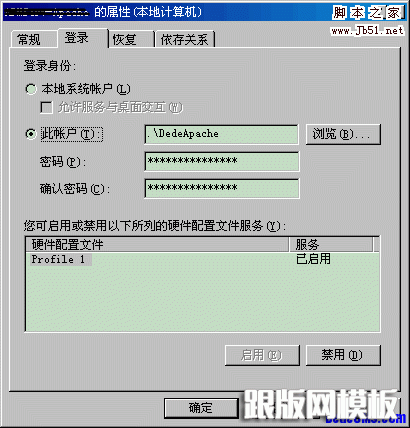 1.3.计算机管理里面选择服务,找到apache2.2,先停止服务,右击->属性,选择登陆,把单选框从本地系统帐户切换到此帐户,然后查找 选择DedeApache,输入密码DedeApachePWD,然后点确定(这个时候apache还不能正常启动,一般情况肯定会报错:Apache2.2 服务因 1 (0x1) 服务性错误而停止。);