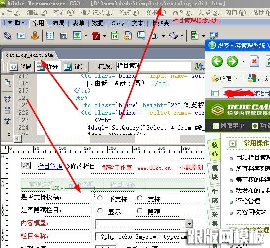 到这里数据库字段添加好了。 接下来我们开始做后台。大家写找到后台栏目管理模版! 要更改的 2个 D:\www\dede\templets 模版:catalog_add.htm、catalog_edit.htm 下面就演示一个