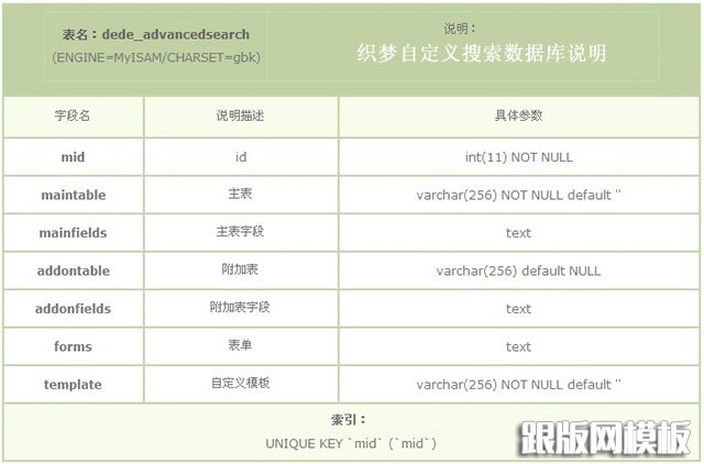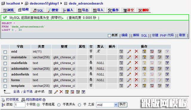 DEDECMS默认自定义搜索数据库表说明(wmd_advancedsearch) 2016-12-12dedecms教程 419 简要说明: ①wmd_advancedsearch织梦自定义搜索的数据库字段。 ②forms字段是表单字段;addonfields字段是附加表字段;maintable字段是主表;addontable是附加表。 ③大家可以用phpmyadmin进入网站数据库查看: The End