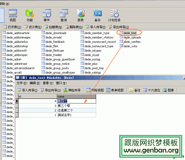 这里我们这个数据库叫dedebbs,表前缀用的默认的"wmd_",我们用Navicat for MySQL来创建一个名为"wmd_test"的表,里面就2个字段,1个id,作为唯一标识,另一个name作为名称(图1).然后往里面添加测试数据(图2),这个操作类似于Access或者EXCEL,比较简单,这里不做冗述.
