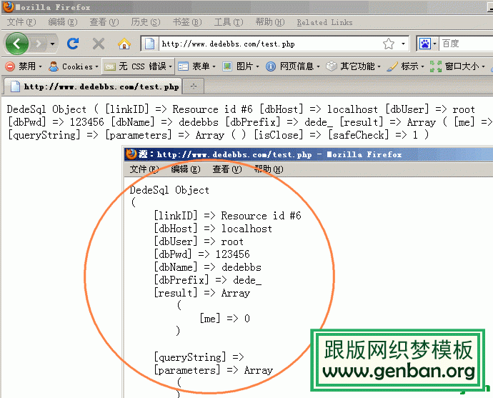 上面代码就是将一个$dsql类输出,我们再执行下这个文件http://www.genban.org/test.php(注genban.org只是在本地做了个解析,其实就是localhost),我们查看源代码,看到下面的内容(图4):