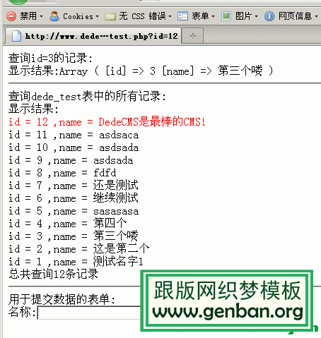 echo "<font color='red'>id = {$dbobj->id} ,name = {$dbobj->name}</font> <a href='test.php?dopost=del&id={$dbobj->id}'>[删除]</a> <br />";//这里增加了一个删除的超链接