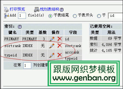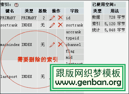 这个表有 PRIMARY、sortrank、mainindex、lastpost ,四组索引,实际上因为这个表本身很少,设置过多的索引反而没多大的必要,由于dedecms里的程序默认都是用sortrank这字段排序的,建议保留PRIMARY、sortrank两个索引,删除mainindex、lastpost,具体操作如下图: