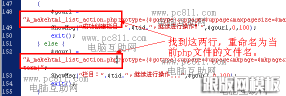 第8步:还是在A_makehtml_list_action.php最低部找到如下图所示的两个代码,在148和152行,把makehtml_list_action.php全都改成“A_makehtml_list_action.php”并保存。