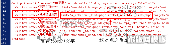 第1步:找到并打开dede\inc\inc_menu.PHP文件,在大概第144行下面添加“<m:item name='浏览栏目更新' link='A_makehtml_list.php' rank=A_makehtml_list.php' target='main' />”并保存。