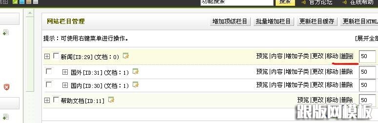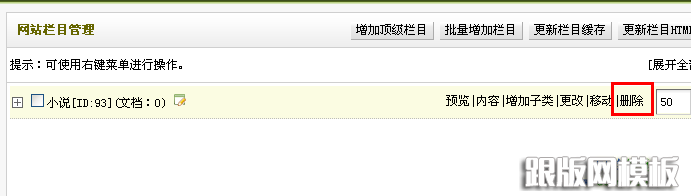 我们先看一下如何删除栏目,其实非常简单,例如后台,直接在要删除的栏目后面点击删除即可,如下图所示: