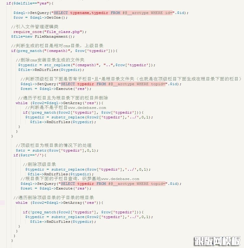 1. 经过我的研究发现织梦有一个文件管理逻辑类file_class.php,专门处理文件的,这里面有一个方法RmDirFiles($indir),它是用来删除栏目的,而且是递归删除,分析一下这个代码我们发现,他连文件夹里面的文件也一起删除,正好是我们需要的。