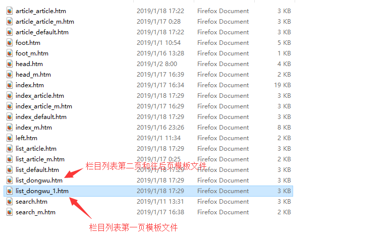 系统在动态或者生成静态时,栏目列表第一页优先去找这个 _1 的第一页模板文件,存在就输出,不存在就使用默认的原列表模板 list_dongwu.htm