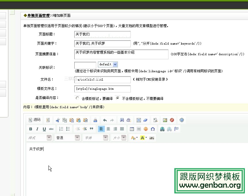 2、 是否编译内容——如果这里选择“是”,那么下面的内容就可以直接输入织梦的各种调用标签,系统会自动把他们解析后输出。比如调用文档列表,可以用arclist标签。、