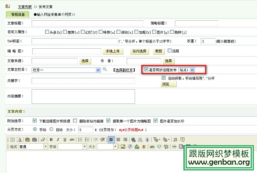 新建一个栏目,然后去发布一篇文章,我们会发现在“文章主栏目”一栏中会多出一个选项“是否同步远程发布”