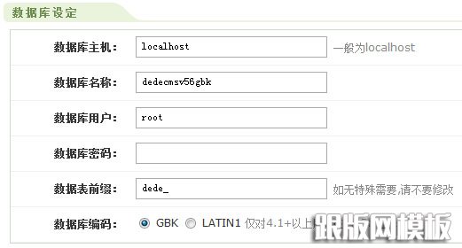 数据库名称、数据库用户、数据库密码都是空间商提供给数据信息。如果是在搭建的,则填写你设置的数据库信息。如果是数据库安装一个Dedecms的话,数据表前缀留默认即可,如果同一数据库装多个Dedecms则需要修改数据表前缀进行区分,否则每安装新的一套时,如果用相同前缀,已经存有数据的表会被新的覆盖,导致数据丢失。数据库编码默认选取GBK。