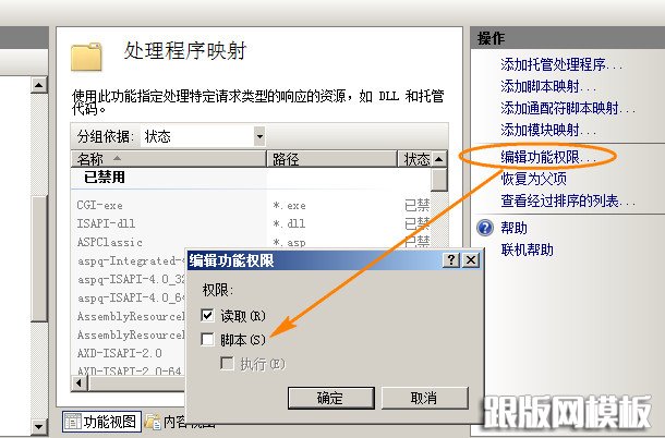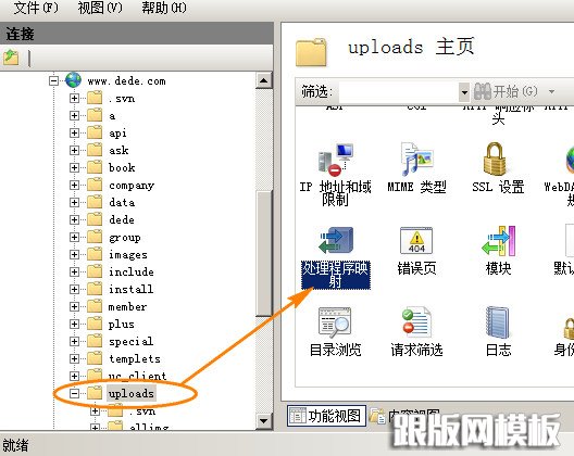 IIS7也类似于IIS6.0,选择站点对应的目录,data、uploads及静态html文件目录,双击功能试图面板中的“处理程序映射”(如图2)
