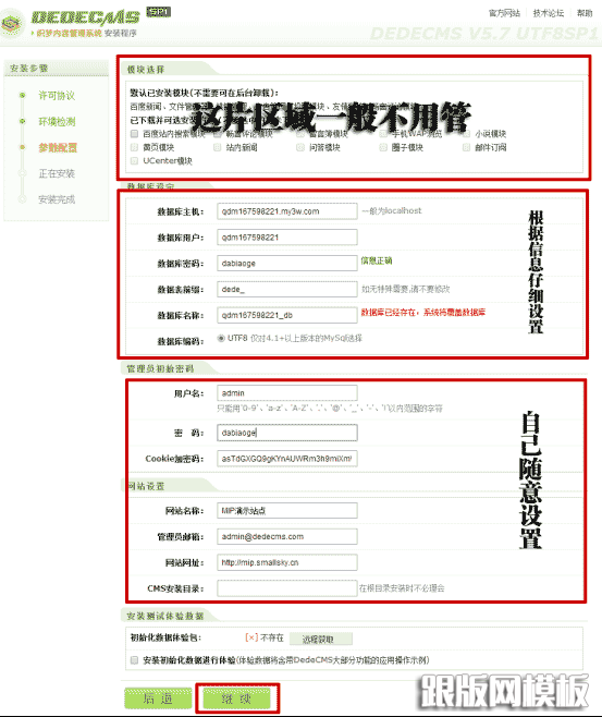 第4步,这里是最重要的一部分,根据上图,模版选择那里我们基本不需要选择什么,开始第二块,数据库设定,这里涉及到几个概念“数据库主机”、“数据库名称”、“数据库用户”、“数据库密码”、“数据表前缀”、“数据库编码”。请自己将空间商或者自己创建的数据库信息对照着填写完整。