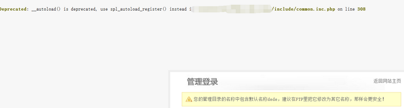 打开首页正常,登录后台的时候直接提示“Deprecated: __autoload() is deprecated, use spl_autoload_register() instead in**********”,如下图: